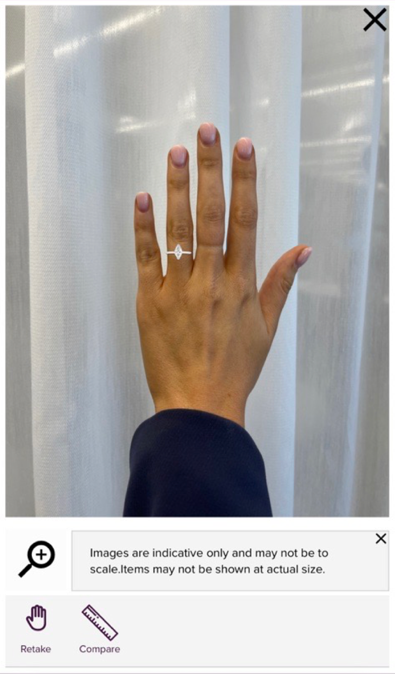 Our technology uses artificial intelligence to create a 3D model of your hand, which is then used to simulate the experience of trying on jewellery in real life. Augmented reality overlays our pieces onto the 3D model, allowing you to see how they look on you. The ring image will automatically adjust to your finger size, and you can move the ring from finger to finger to decide where you would prefer to wear it. You can try on as many rings as you wish, in your own time.